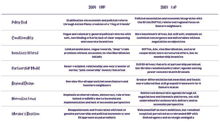 The absence of a membership perspective only fed mistrust: had there been such a perspective, Ukraine would have been more willing to absorb EU conditionality, but without it, the EU approach was seen as paternalistic and not considering Ukraine's own agency and geopolitical interests. Not to mention that in 2004 10 states entered the EU, after being locked into a fast track for membership. Moreover, eight of them were former communist countries of Central and Eastern Europe, with two more to follow in 2007. Many of them were also quite supportive of a greater EU engagement with Ukraine, including the necessity to acknowledge it as a potential member state. Ultimately, the absence of a membership horizon not only eroded the legitimacy of EU conditionality but also disempowered pro-European reformist forces in Kyiv, which had limited bargaining leverage in shaping the direction of bilateral cooperation.